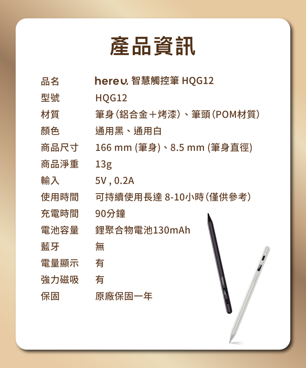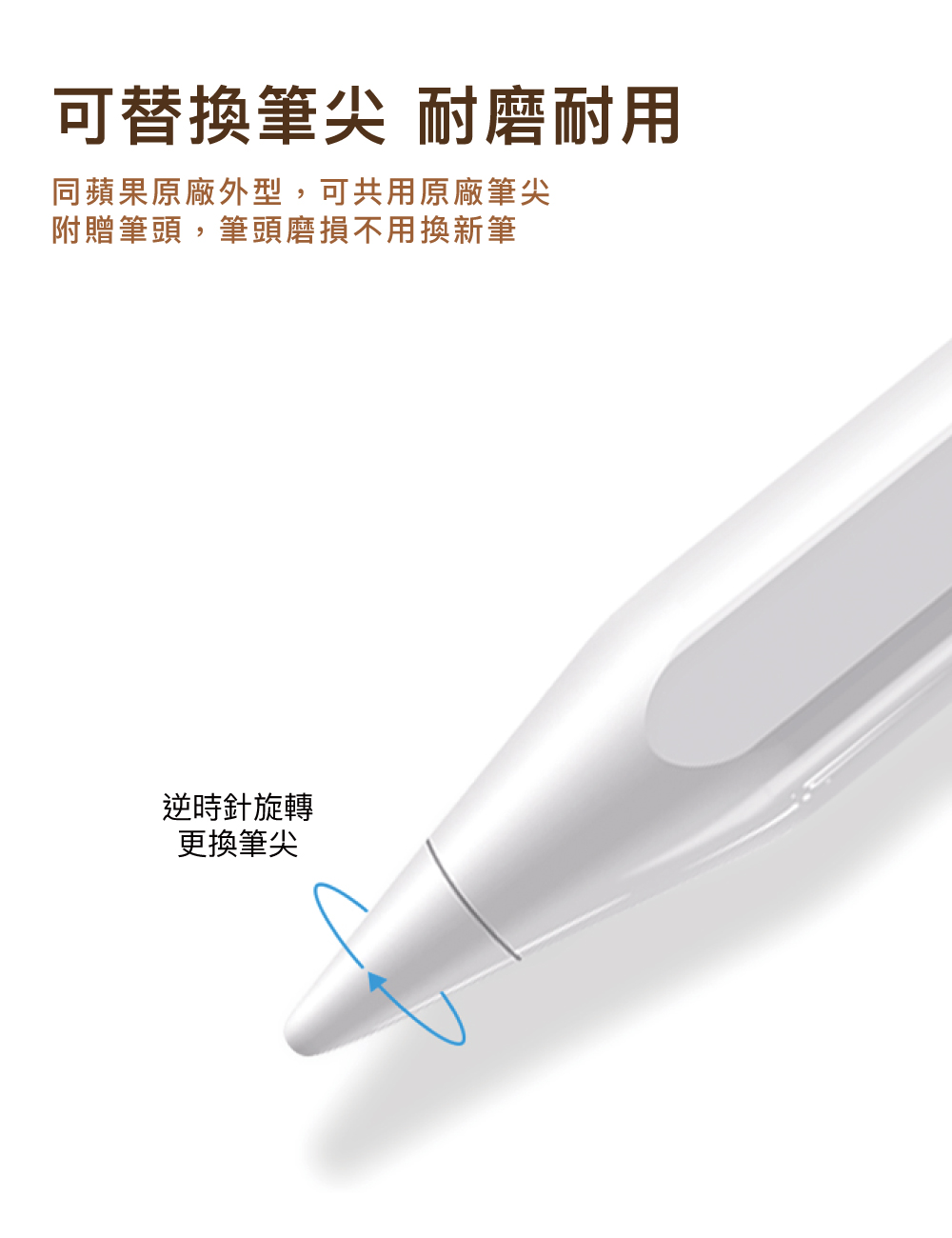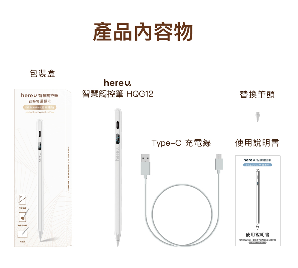 內容物:智慧觸碰筆、充電線、說明書、備用筆頭*1 材質:筆身(鋁合金+烤漆)、筆頭(POM材質)